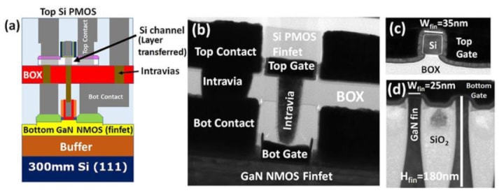 如何進行晶體管的堆疊呢?大致兩種方法,第一種就是在晶圓上通過特殊工藝將晶體管直接做成多層的;另外一種就是和傳統(tǒng)工藝相同的方法在晶圓上制作一層晶體管,然后將多個晶圓堆疊起來,晶圓之間通過TSV連接。關(guān)于第一種方法,目前有很多研究,例如將NMOS堆疊在PMOS上,從而節(jié)省一半的面積,使晶體管密度提升一倍。其難點在于上層的晶體管沒有致密的硅基底作為支撐,很難制作出高質(zhì)量的晶體管,另外,目前的技術(shù)也只能支持兩層堆疊。