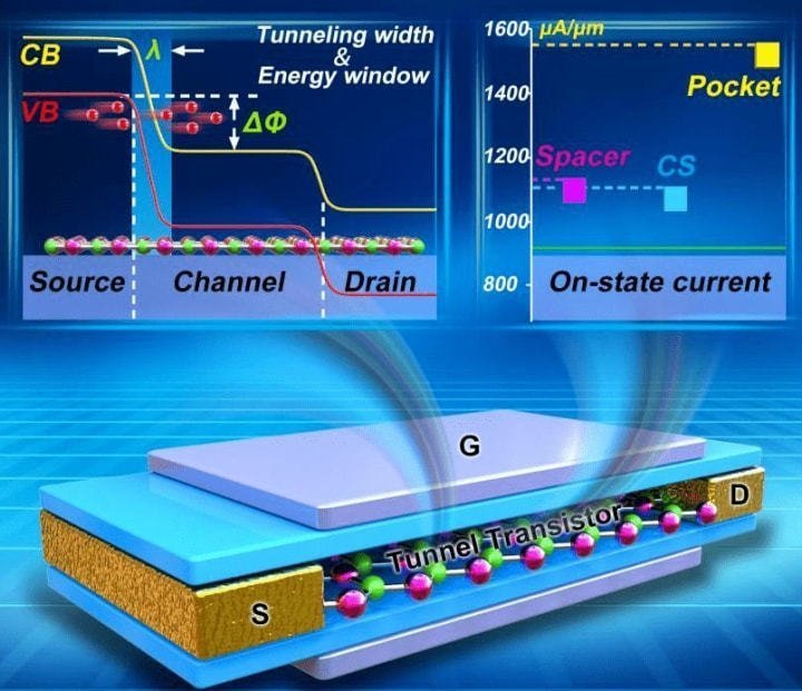 隧道場效應(yīng)晶體管(TFET-Tunnel Field Effect Transistor),和傳統(tǒng)MOSFET晶體管原理不同,在TFET中源極和漏極摻雜不同。它使用量子力學(xué)隧道效應(yīng),柵極和源極之間的電壓決定了電荷載流子是否可以“隧穿”通過源極和漏極之間的能量勢壘,以及電流是否可能流動。