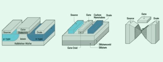 由于量子力學(xué)隧道效應(yīng),電子可以穿越絕緣體,這將使元件功能失效。人們開始尋找一種新型晶體管,可以進一步提高未來集成電路的性能,作為傳統(tǒng)晶體管的替代品。目前有很多研究,但還沒有領(lǐng)先者可以取代硅MOSFET。研究人員列出了一系列MOSFET替代品,包括隧道場效應(yīng)晶體管TFET,碳納米管場效應(yīng)晶體管,單原子晶體管。