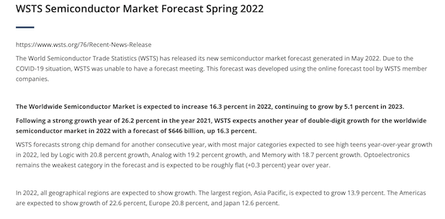 近日,半導(dǎo)體行業(yè)權(quán)威機(jī)構(gòu)世界半導(dǎo)體貿(mào)易統(tǒng)計(jì)協(xié)會(huì)(WSTS)官網(wǎng)發(fā)布了關(guān)于全球半導(dǎo)體市場(chǎng)的最新預(yù)測(cè)數(shù)據(jù)。數(shù)據(jù)顯示,2022年世界半導(dǎo)體市場(chǎng)預(yù)計(jì)增長(zhǎng)16.3%,到2023年將繼續(xù)增長(zhǎng)5.1%。